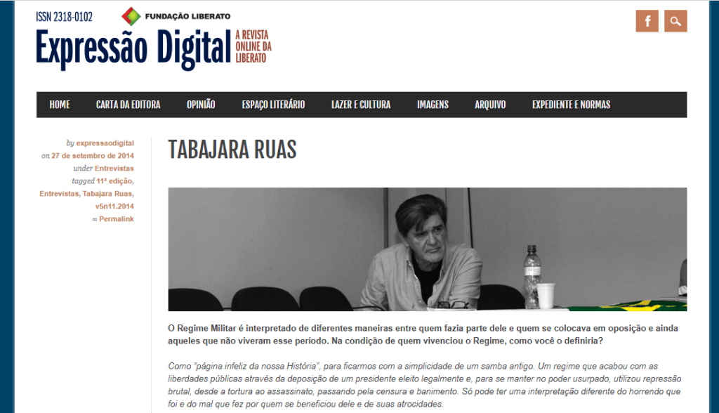 Entrevista com o escritor gaúcho Tabajara Ruas, publicada na revista Expressão Digital, em suas edições eletrônica (setembro de 2014) e impressa (outubro de 2014).