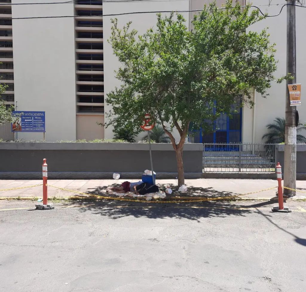 Hoje, domingo, 11 da manhã. A missa terminou. Na calçada ao lado da igreja, o morador de rua dorme à sombra. Jesus é uma árvore.
