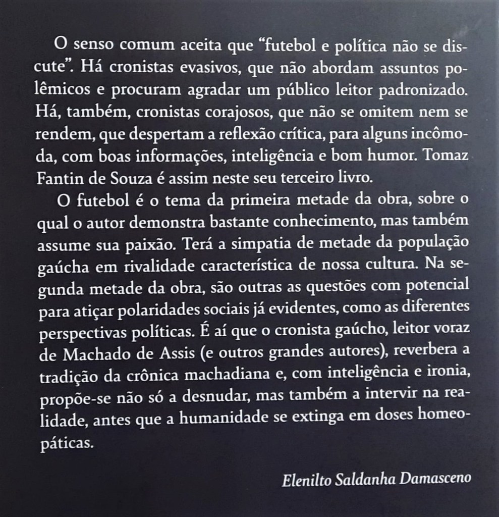 O senso comum aceita que “futebol e política não se discute”. Há cronistas evasivos, que não abordam assuntos polêmicos e procuram agradar um público leitor padronizado. Há, também, cronistas corajosos, que não se omitem nem se rendem, que despertam a reflexão crítica, para alguns incômoda, com boas informações, inteligência e bom humor. Tomaz Fantin de Souza é assim neste seu terceiro livro.